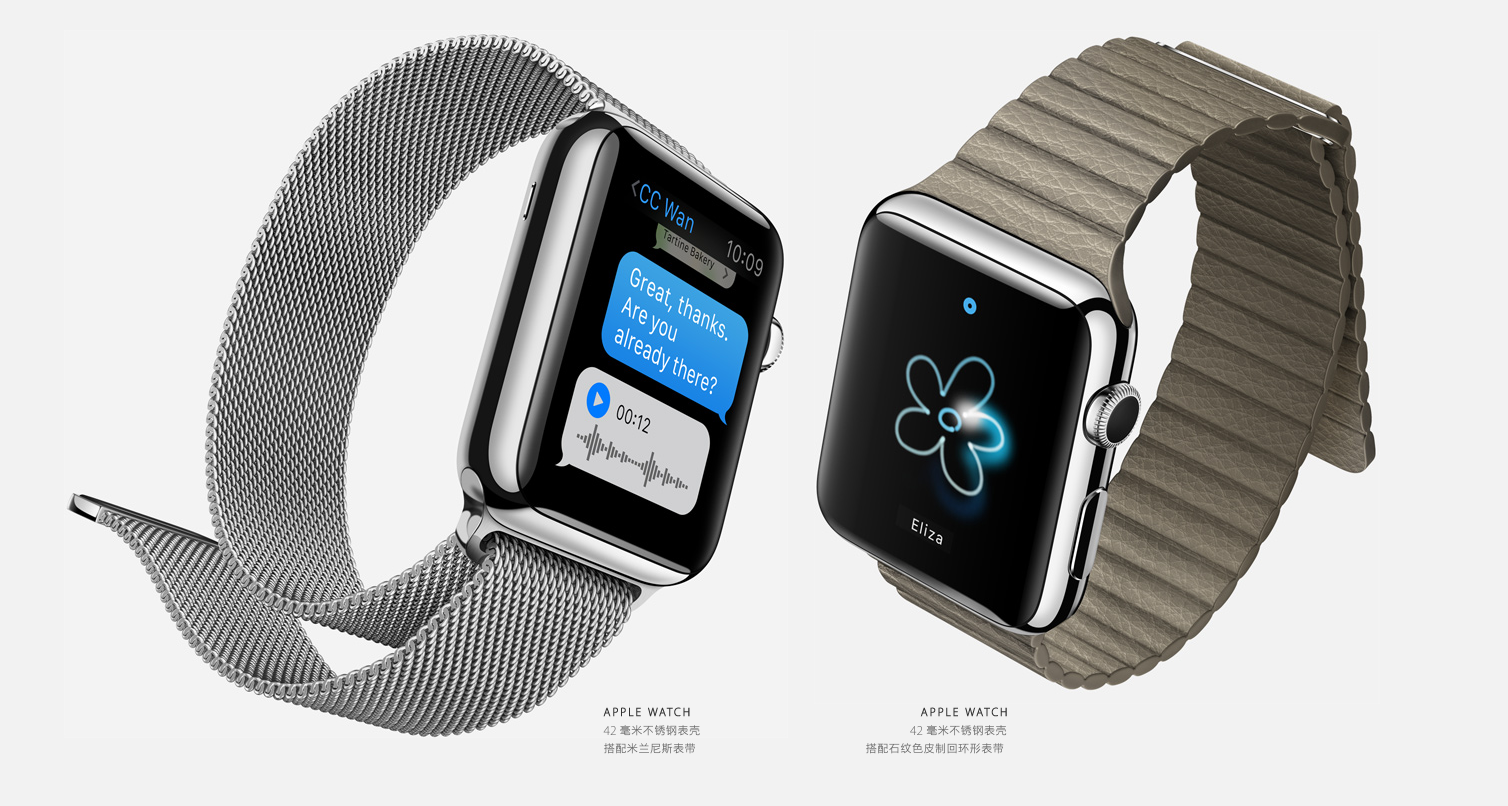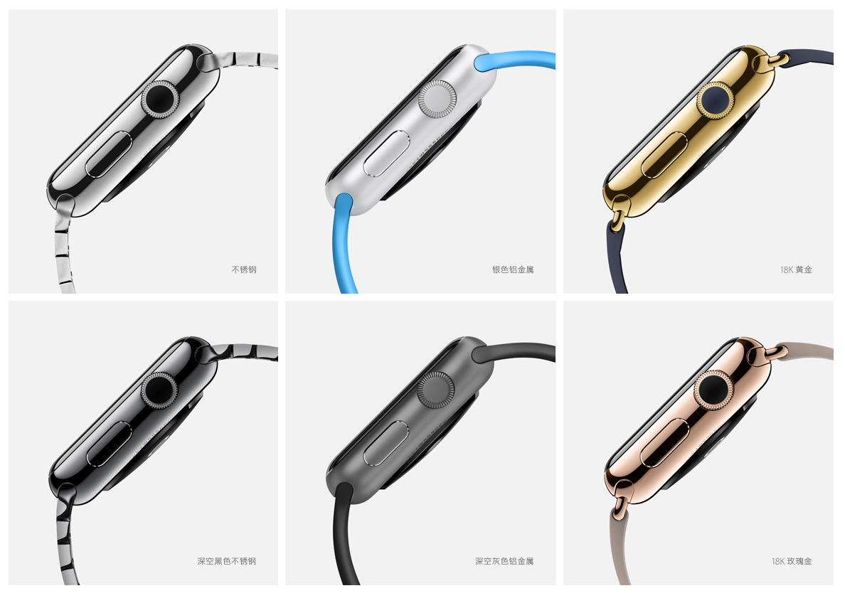 蓝宝石弧形屏幕,让 Apple Watch 可以在任何情况下佩戴,但 38 毫米和 42 毫米的两种厚度(屏幕尺寸不同)都让普通用户有些难以接受。除了表芯部分,表带也是智能手表的重点。六种包括塑胶、金属等材质的表带可以适应不同的人群在不同的场合下佩戴。包括其中有一款表带采用磁力搭扣设计,它采用塑胶内嵌磁铁的方式用户佩戴时非常轻松,极具现代感。