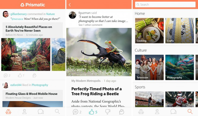 Prismatic 是一家采用智能推荐算法为用户提供感兴趣内容的公司,听起来似乎非常体现同质化,实质上它与其他这类公司不一样。严格的说来,Prismatic 并不算初创公司,2012 年底就有关于它运行架构的分析,但它官网一直以类似 Google Reader 的形式存在,直到 2013 年它才发布手机客户端作为实力的证明,颇有些“对投资过意不去才这么做”的感觉。(Prismatic 在 2013 年拿到了 1500 万美元的高额投资)