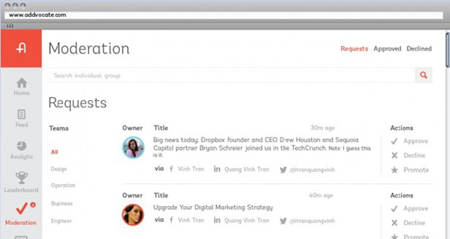 Addvocate 由 Salesforce 前社交媒体部门主管 Marcus Nelson 创办,一举解决了员工对“转发公司活动微博或推文”的通知装作看不到的问题。如图所示,管理者可以在 Addvocate 网站上、Chrome 插件中、或通过 Addvocate for iOS 批量操作员工的社交网络账户。
