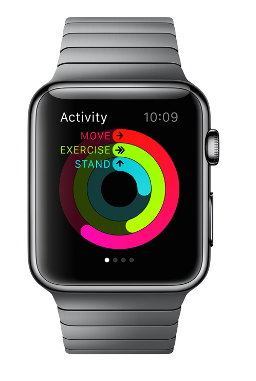 Apple Watch 中内置的 Activity 是 Apple Watch 的一个重要第一方应用,它负责掌管 Apple Watch 的几乎所有运动记录功能。"运动" 圆环显示你消耗了多少卡路里;"锻炼" 圆环显示你进行了多少分钟的轻度运动;而 "站立" 圆环则显示你站起身来的频率。这些数据可以直接被 Apple Watch 中的运动相关 App 引入提出更切合实际可执行的健身方案,也可以被导入到 iOS 8 设备中的 Healthkit 健康中心,分享给任意第三方健康、运动应用。