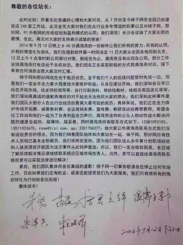 本周内,国内多家媒体报道了国内在线教育创业公司 91 外教网的创始人龚海燕的另外一个项目,教育资源共享平台梯子网因为资金链断裂,导致大规模裁员,项目面临破产倒闭的情况。当时,包括新浪、36Kr 等国内门户和创业媒体都以「重心转移」为标题,援引了该公司内部人士和其他媒体的报道,称龚海燕将把发展重心转移至核心业务 91 外教网,以及教学直播互动平台那好网上。